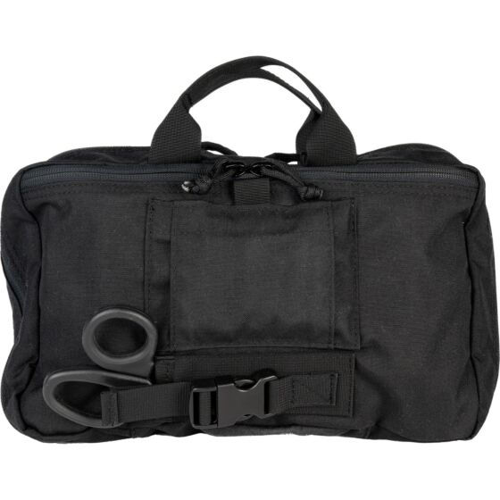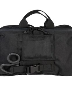 One side of the bag’s exterior includes trauma shears at the ready as well as several pairs of nitrile gloves, while the opposite side features a MOLLE-style system to accommodate extra equipment as needed, such as additional tourniquets, ammo, or personal protective equipment. This arrangement is ideal for customizing the carriage of gear that requires immediate access.